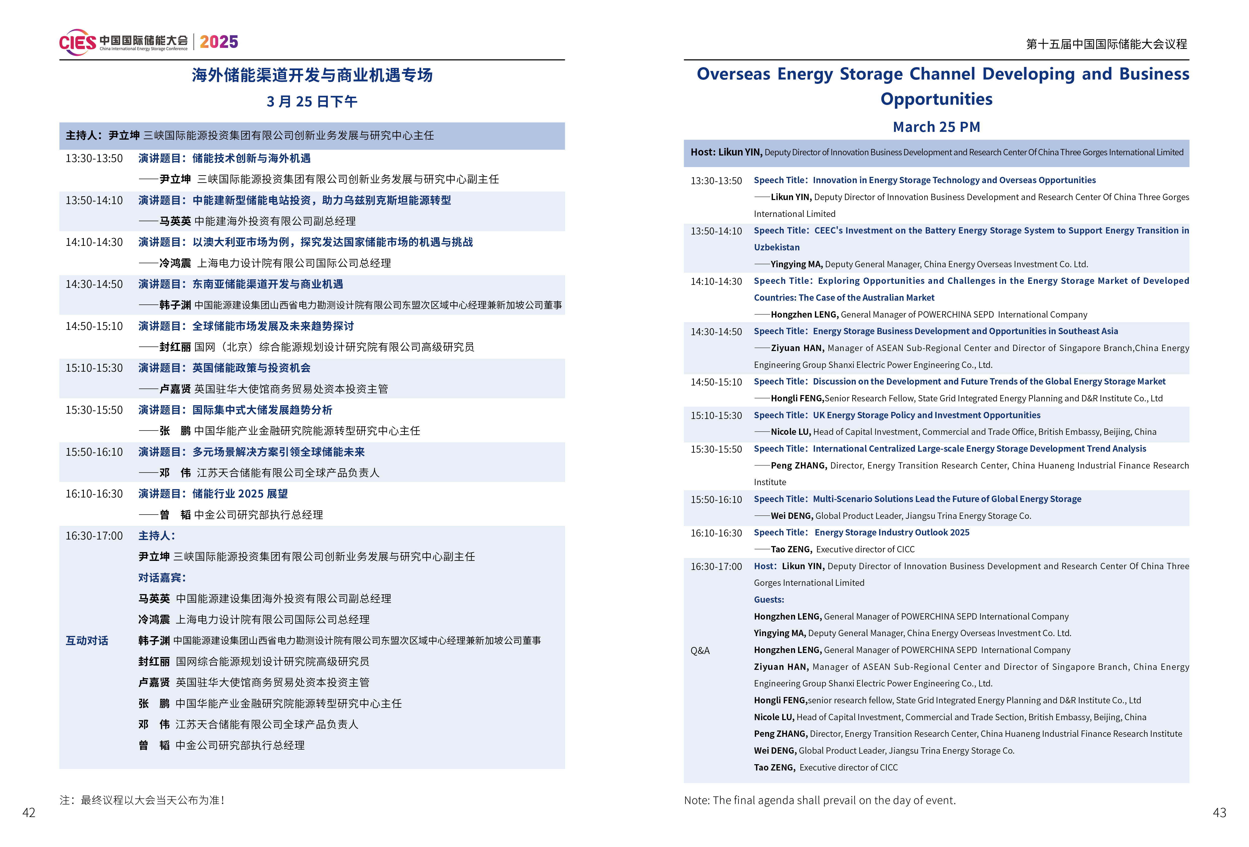 CIES2025儲(chǔ)能大會(huì)將設(shè)置:大會(huì)開(kāi)幕式暨特邀院士專家報(bào)告、數(shù)智化配電網(wǎng)與新型儲(chǔ)能融合創(chuàng)新、新型電力系統(tǒng)與并網(wǎng)調(diào)度、新型儲(chǔ)能與新能源大基地協(xié)同發(fā)展、國(guó)際儲(chǔ)能、電力輔助服務(wù)、現(xiàn)貨交易及容量市場(chǎng)、工業(yè)綠色微電網(wǎng)、國(guó)家儲(chǔ)能標(biāo)準(zhǔn)宣貫、數(shù)智化新型儲(chǔ)能系統(tǒng)集成解決方案(上、下)、儲(chǔ)能消防、安全與檢測(cè)認(rèn)證、新型儲(chǔ)能資本與投資、液流電池、儲(chǔ)熱與長(zhǎng)時(shí)儲(chǔ)能、混合儲(chǔ)能、2025 新型儲(chǔ)能系列研究報(bào)告暨行業(yè)百?gòu)?qiáng)發(fā)布、數(shù)智化工商業(yè)儲(chǔ)能解決方案與商業(yè)案例、虛擬電廠與車(chē)網(wǎng)互動(dòng)、海外儲(chǔ)能渠道開(kāi)發(fā)與商業(yè)機(jī)遇、構(gòu)網(wǎng)型儲(chǔ)能系統(tǒng)及項(xiàng)目建設(shè)、儲(chǔ)能專用電池與ESG、新品發(fā)布會(huì)等23個(gè)專場(chǎng),以下為海外儲(chǔ)能渠道開(kāi)發(fā)與商業(yè)機(jī)遇專場(chǎng)議程(最終議程以大會(huì)當(dāng)天發(fā)布為準(zhǔn))。