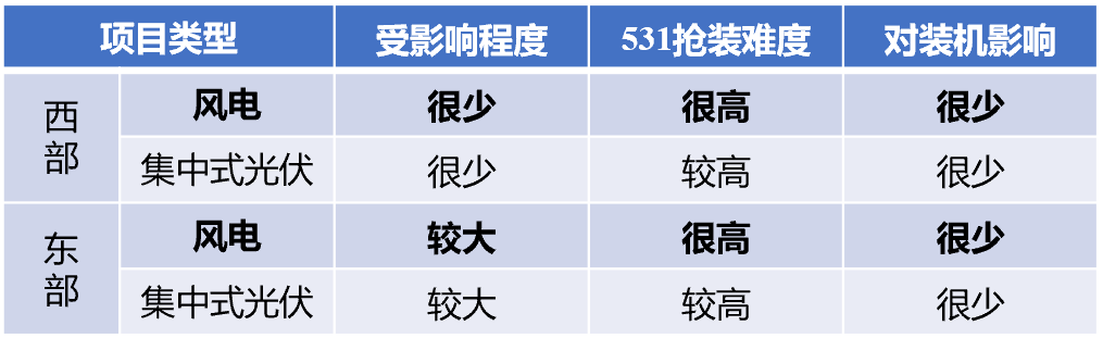 對于集中式風(fēng)電、光伏項目而言,受影響程度及搶裝難度如下表所示。