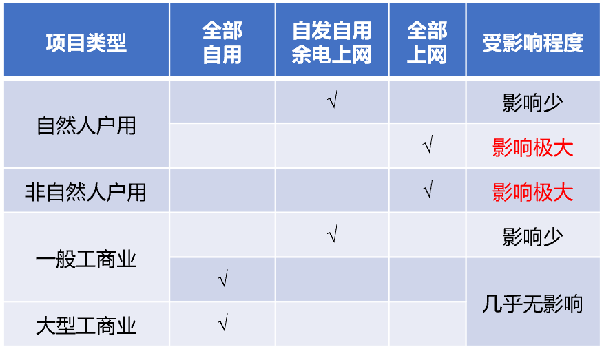 戶用光伏項目,目前市場上以“非自然人戶用”為主,基本采取全額上網(wǎng)的方式,從之前100%脫硫煤電價收購,到現(xiàn)在的100%市場化交易,受沖擊最大。