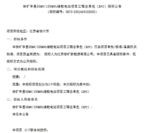 中國(guó)儲(chǔ)能網(wǎng)訊:2月18日,江蘇徐礦新能源有限公司發(fā)布了徐礦豐縣50MW/100MWh儲(chǔ)能電站項(xiàng)目工程總承包(EPC)招標(biāo)公告,項(xiàng)目位于江蘇省徐州市豐縣經(jīng)濟(jì)開(kāi)發(fā)區(qū),本期項(xiàng)目建設(shè)50MW/100MWh磷酸鐵鋰儲(chǔ)能,擬新建儲(chǔ)能電站單回110kV線路T接110kv常史966線,新建110kv桿塔1基、電纜通道長(zhǎng)約0.067km,電纜采用400m㎡截面單芯電纜。