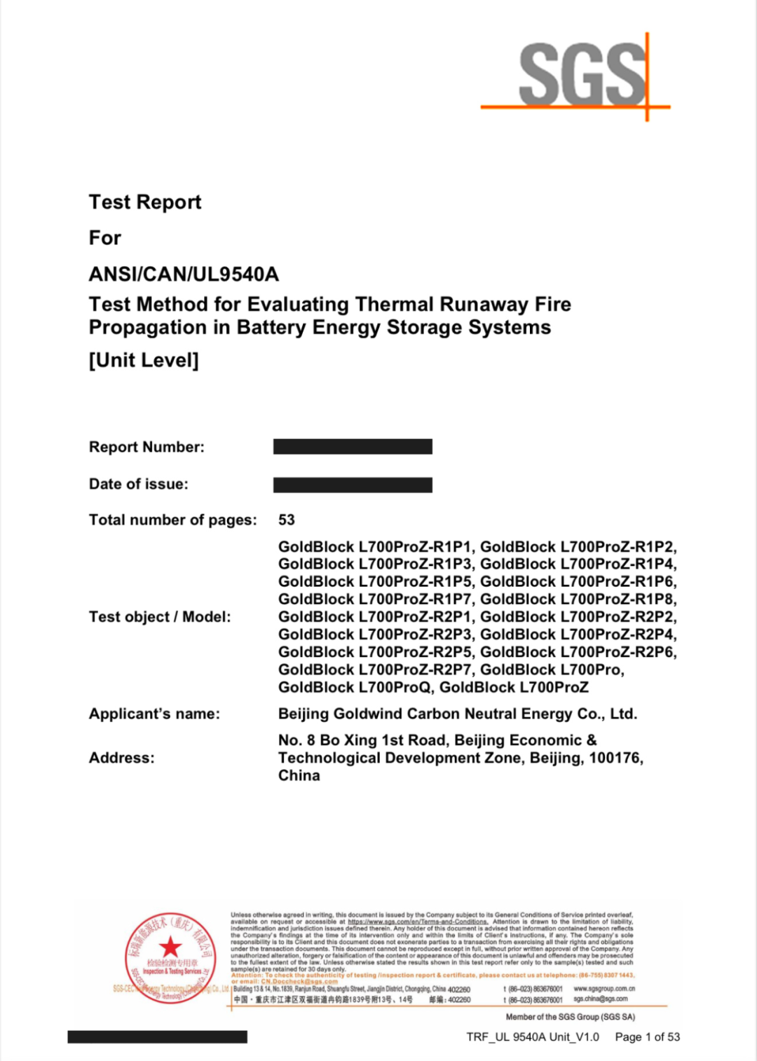 UL 9540A測(cè)試模擬針刺、過(guò)充、高溫等電芯熱失控?cái)U(kuò)散的極端場(chǎng)景。在測(cè)試過(guò)程中,GoldBlock L700儲(chǔ)能系統(tǒng)采用更嚴(yán)苛的排布方式,成功將熱失控影響控制在模組級(jí)別,驗(yàn)證了單顆電芯故障不會(huì)引發(fā)Pack級(jí)連鎖反應(yīng),充分證明了產(chǎn)品安全性。