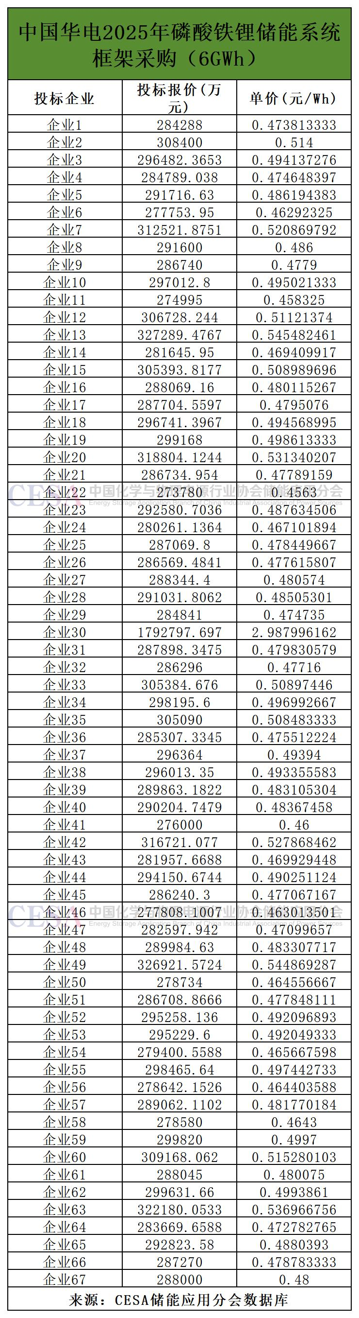 開標(biāo)信息顯示,本次框采競爭激烈,共吸引67家企業(yè)投標(biāo),最低報價273780萬元,折合單價0.4563元/Wh。