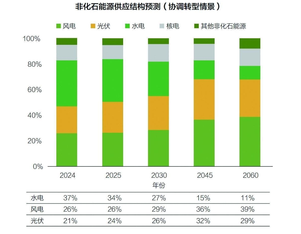2024年,我國非化石能源供應(yīng)總量增至11.8億噸標(biāo)準(zhǔn)煤,以電力形式為主。其中,水力、核能、風(fēng)力、光伏發(fā)電量分別約為1.44萬億、0.45萬億、1萬億、0.81萬億千瓦時(shí)。非化石能源發(fā)電裝機(jī)容量、發(fā)電量以及在一次能源總量中的份額穩(wěn)步提高,正在成為我國能源系統(tǒng)增量的主體,遠(yuǎn)期將成為我國的主導(dǎo)能源。