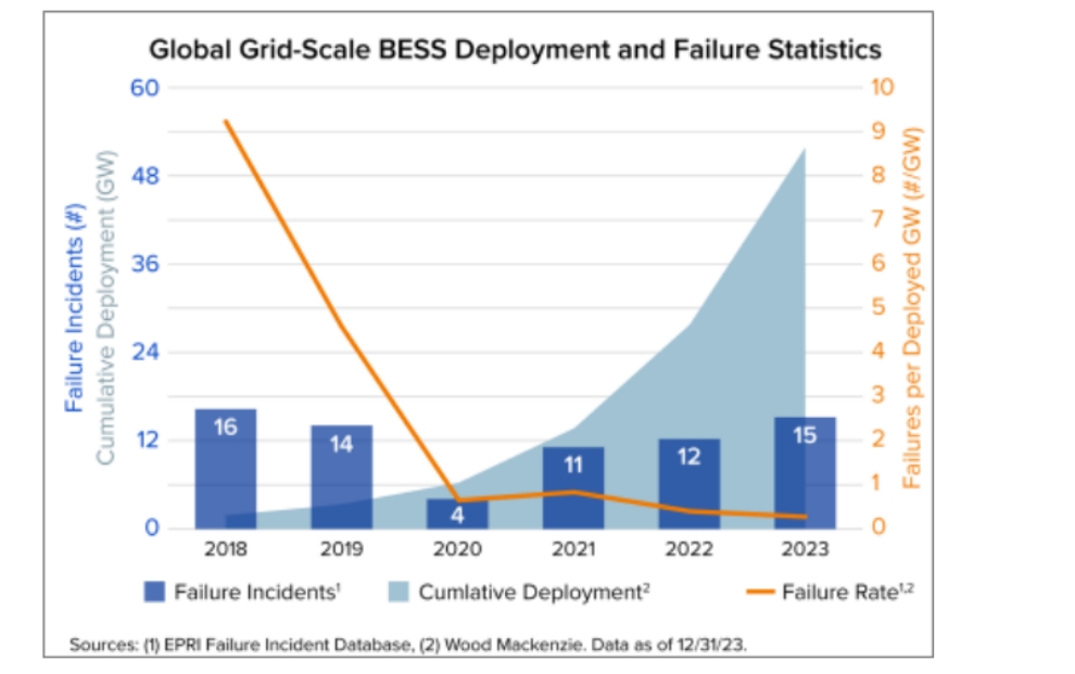 圖1:EPRI公司和Wood Mackenzie公司發(fā)布的全球電網(wǎng)規(guī)模電池儲能系統(tǒng)部署及故障統(tǒng)計數(shù)據(jù)
