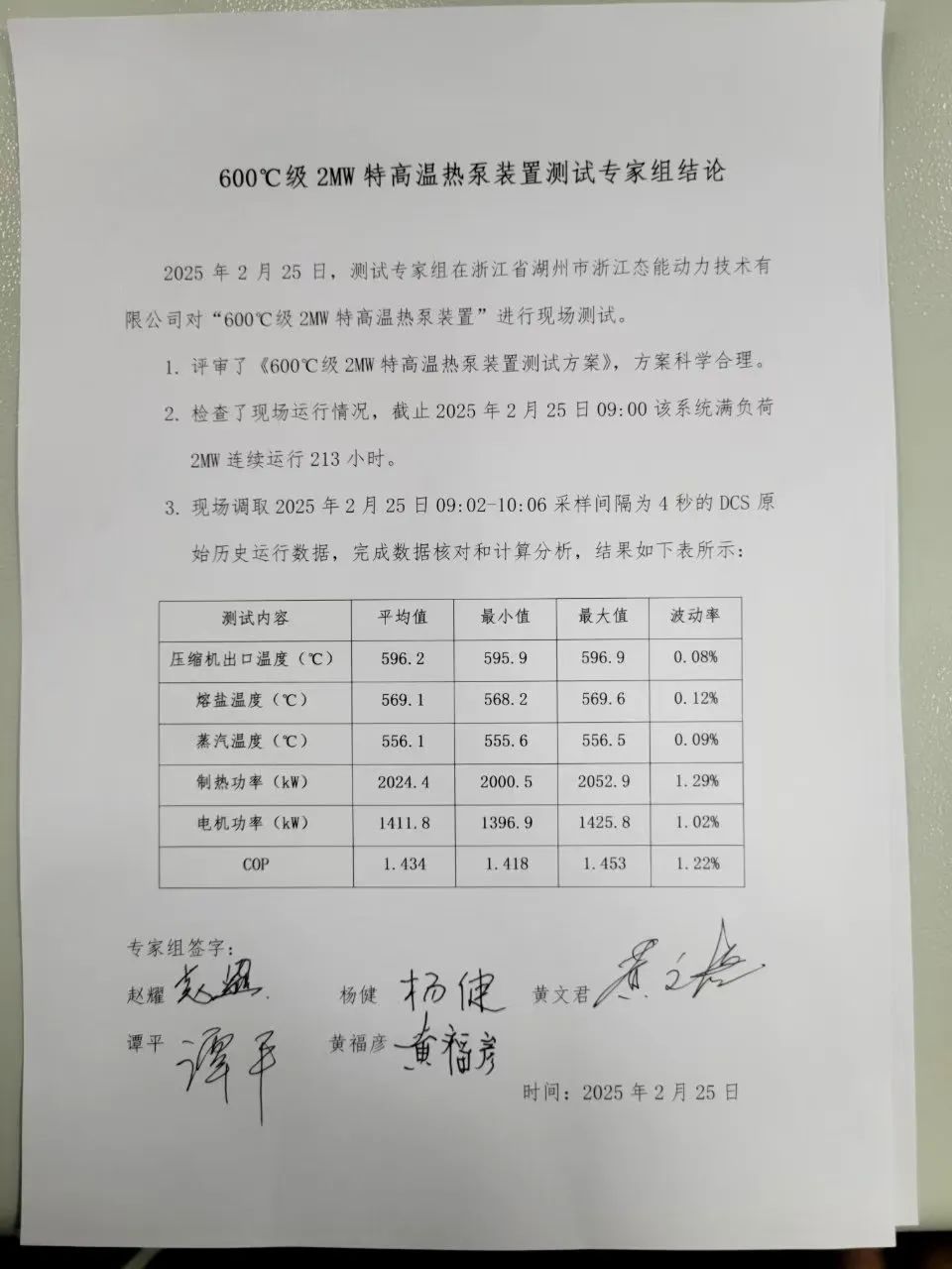 2月25日,浙江大學(xué)、上海交通大學(xué)、浙江科技大學(xué)、浙江正泰中自控制工程有限公司5名專(zhuān)家對(duì)裝置運(yùn)行開(kāi)展了現(xiàn)場(chǎng)測(cè)試,專(zhuān)家組測(cè)試后一致認(rèn)為:“截至2025年2月25日09:00,該系統(tǒng)滿(mǎn)負(fù)荷2MW連續(xù)運(yùn)行213小時(shí)。現(xiàn)場(chǎng)調(diào)取2025年2月25日09:02—10:06采樣間隔為4秒的DCS原始?xì)v史運(yùn)行數(shù)據(jù),完成數(shù)據(jù)核對(duì)和計(jì)算分析,實(shí)測(cè)壓縮機(jī)出口平均溫度596.2℃,熔鹽出口平均溫度為569.1℃,熔鹽產(chǎn)蒸汽出口平均溫度為556.1℃,平均制熱功率2024.4kW,平均COP為1.434?!?/span>