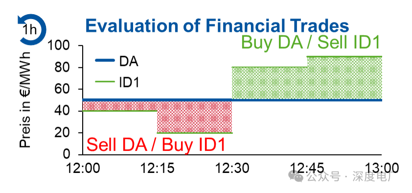 此外,電池收益指數(shù)在跨市場交易中還引入了金融交易,即同時在多個現(xiàn)貨市場進行交易,產(chǎn)生收益。通過在兩個市場中同時開設不同方向的倉位,不存在實際電力交付義務。下圖展示了如何利用日前市場(DA)和日內(nèi)市場(ID1)的價差來評估金融交易的潛力。