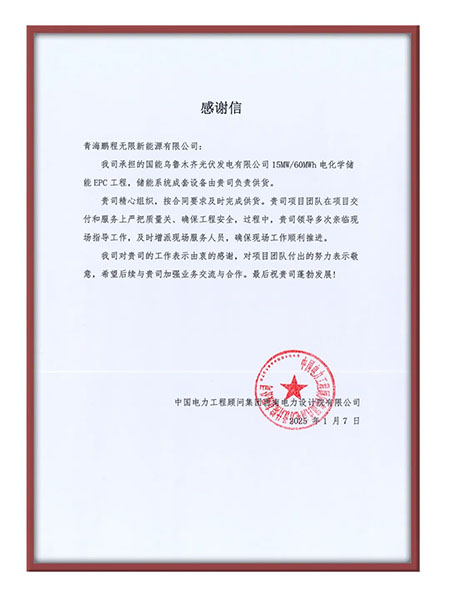 中國儲能網(wǎng)訊:2月23日,中國能建西南院15MW/60MWh儲能電站項目正式并網(wǎng)。鵬程無限收到來自中國能建西南院的感謝信,對鵬程無限的產(chǎn)品與服務(wù)給予了高度評價。