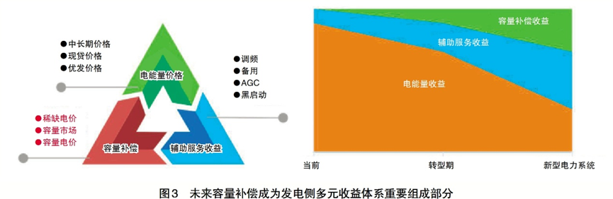 發(fā)電側(cè)容量補(bǔ)償機(jī)制。目前,國(guó)家僅針對(duì)煤電建立了容量電價(jià)機(jī)制,補(bǔ)償水平主要為每年100元/千瓦和165元/千瓦,但長(zhǎng)期來看,建立煤電容電價(jià)機(jī)制可能引導(dǎo)電能量市場(chǎng)價(jià)格下行,不利于其他電源品類回收成本。隨著電力市場(chǎng)加快建設(shè)發(fā)展,電力市場(chǎng)應(yīng)有效發(fā)現(xiàn)電源的電能量?jī)r(jià)值、輔助服務(wù)價(jià)值和容量?jī)r(jià)值。建議適時(shí)建立健全覆蓋發(fā)電側(cè)各電源品類的、與電力市場(chǎng)有效銜接的容量電價(jià)機(jī)制或容量市場(chǎng)機(jī)制,通過市場(chǎng)化方式有效體現(xiàn)各類電源對(duì)系統(tǒng)的支撐調(diào)節(jié)容量?jī)r(jià)值,保障發(fā)電側(cè)長(zhǎng)期容量充裕性(見圖3)。