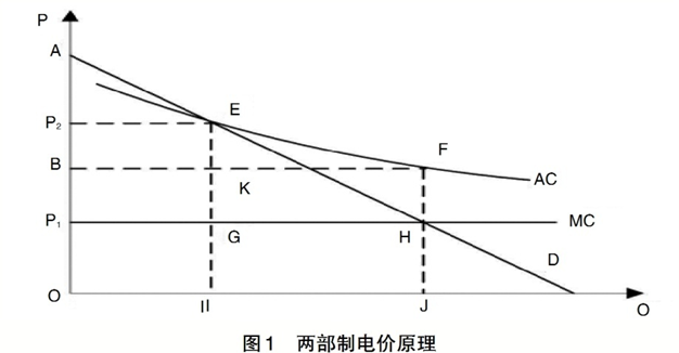 對于固定成本占比較大的商品定價,政府管制最優(yōu)定價是采用兩部制定價,固定成本通過與交易量無關(guān)的基本費用回收,交易價格按單位變動成本確定,全部變動成本按交易量回收。如圖1所示,AC為平均成本曲線,MC為邊際成本曲線,D為用電需求曲線。由于需求曲線D與平均成本曲線AC的交點為E,按平均成本定價的價格為P2,平均成本定價下用電量是I,總成本為面積OP2EI,其中,P1P2EG為固定成本,OP1GI為變動成本。需求曲線D與邊際成本曲線MC的交點是H,按照邊際成本定價的價格為P1,用電量是J,變動成本為面積P1HJO。無論按邊際成本定價還是按平均成本定價,固定成本不變,即矩形P1P2EG面積與矩形P1BFH面積相等。