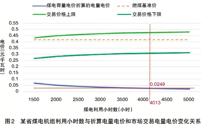 其中P基表示燃煤基準價。根據(jù)上面的計算公式,某省煤電利用小時變化與容量電價折算電量電價和市場交易電量電價的關(guān)系如圖2所示。2023年,該省煤電利用小時為4013小時,垂直紅色虛線表示2024年該省煤電容量電價折算的電量電價。從圖中可以看出,隨著煤電利用小時降低,煤電容量電價折算電量電價提高;相反,如果煤電利用小時增加,則煤電容量電價折算電量電價降低。