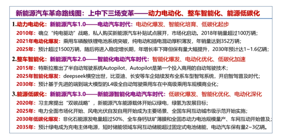 第一,我想從新能源汽車革命路線圖來談談能源低碳化。一般認為就是上半場、下半場,好像沒有第三場。我需要多加一點解釋,新能源汽車革命路線圖上、中、下三場變革,動力電動化、整車智能化、能源低碳化。為什么是這樣?沒有能源低碳化,我們新能源汽車就不是真正的新能源汽車。新能源汽車革命最終要與新能源革命會合才能可持續(xù)發(fā)展。新能源汽車革命路線圖如下: