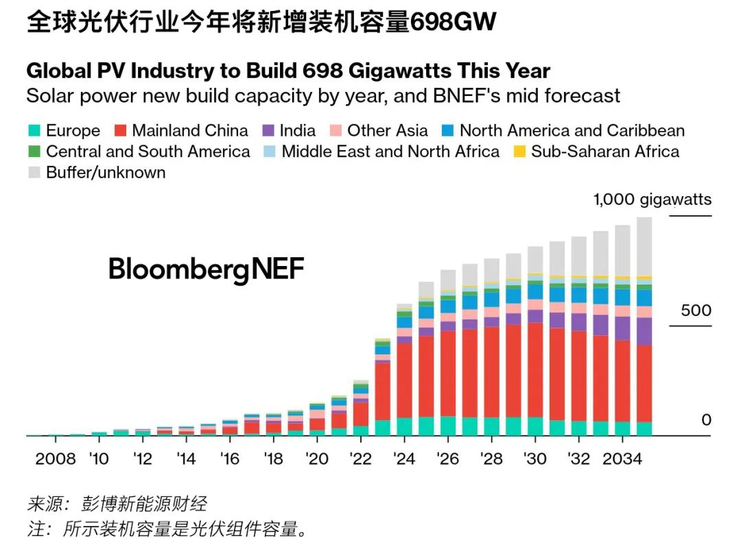 預(yù)計2025年光伏新增裝機(jī)容量將比2024年增長17%,達(dá)到698GW。彭博新能源財經(jīng)現(xiàn)在對2025年的預(yù)測較2024年底高出5%。去年,彭博新能源財經(jīng)的預(yù)測低于中國、印度、巴西和許多較小市場的最終官方數(shù)字。