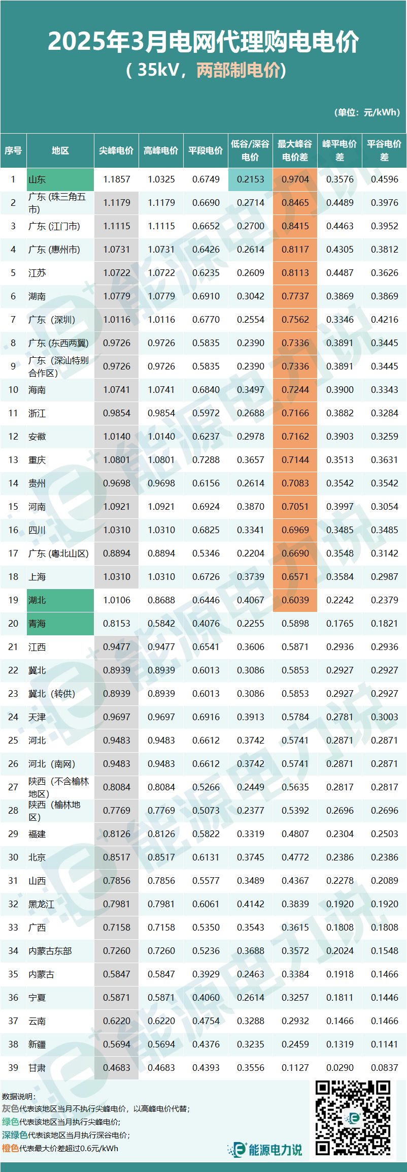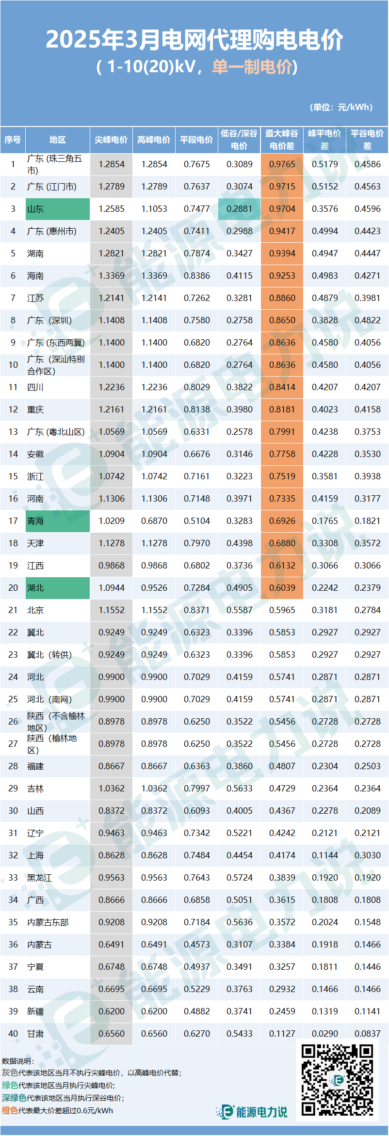 2025年3月,山東、青海、湖北尖峰電價(jià)。