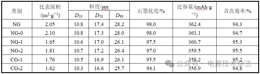 取致密化天然石墨NG-2與普通石油焦二次顆粒人造石墨(骨料D50為10 μm,二次顆粒D50為14 μm)復(fù)合,得到復(fù)合石墨CG-1 [70%(質(zhì)量分?jǐn)?shù))NG-2+30%(質(zhì)量分?jǐn)?shù))人造石墨]與CG-2 [50%(質(zhì)量分?jǐn)?shù))NG-2+50%(質(zhì)量分?jǐn)?shù))人造石墨]。