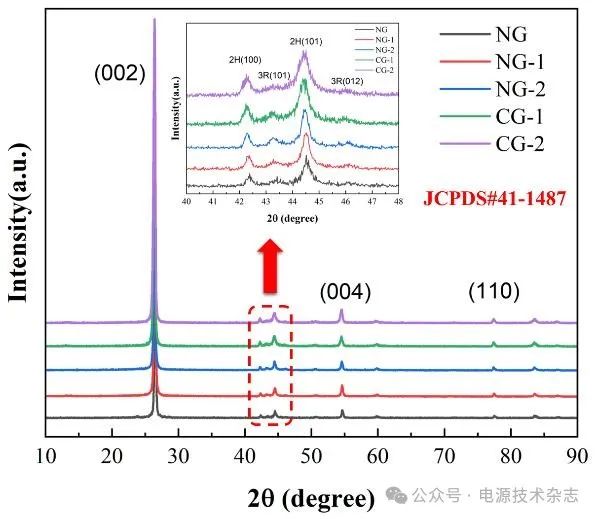 圖3為不同種類石墨材料的X射線衍射(XRD)圖,從中可以看到,幾種材料的(002)晶面衍射峰位置基本一致,表明材料層狀結(jié)構(gòu)基本一致[13]。將2θ角度在40°~48°的XRD衍射圖放大,可以發(fā)現(xiàn)NG、NG-1和NG-2三款天然石墨材料不僅具有六方結(jié)構(gòu)的2H相,還明顯可以看到有菱形結(jié)構(gòu)的3R相存在,表明天然石墨同時(shí)具有2H相和3R相,而人造石墨一般只有2H相,沒有3R相存在。因此,從圖3的放大圖中可以看到,復(fù)合部分人造石墨的復(fù)合石墨CG-1與CG-2的3R相對(duì)應(yīng)的峰強(qiáng)度隨人造石墨占比提高而降低。添加30%人造石墨的CG-1的XRD圖譜中還可以看到3R相的存在,但相比純天然石墨NG-2,3R相的峰強(qiáng)度有所降低;添加50%人造石墨的CG-2的XRD圖譜中則幾乎無法看到3R相的存在,表明當(dāng)材料中3R相的比例較低時(shí),在XRD譜圖中很難發(fā)現(xiàn)其存在。