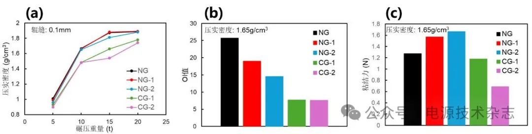 針對(duì)石墨負(fù)極材料,涉及到一個(gè)取向性的概念,一般用OI值來表示;OI值的計(jì)算方法為XRD譜圖中(004)峰與(110)峰的峰強(qiáng)度比值,OI值越小,材料的各向同性越好,越有利于膨脹控制及Li+的擴(kuò)散。圖4(b)為不同石墨極片的OI值柱狀圖,通過純天然石墨NG、NG-1和NG-2的對(duì)比,可以看到對(duì)天然石墨進(jìn)行致密化處理,可降低極片OI值,這是因?yàn)轭w粒內(nèi)部孔隙被填充后,材料在碾壓時(shí)更能保持原有的取向性,而不是趨于一致的取向,因此OI值有所降低;復(fù)合人造石墨后,因復(fù)合的人造石墨為二次顆粒產(chǎn)品,各向同性較好,因此復(fù)合材料OI值相比純天然石墨NG-2顯著降低。