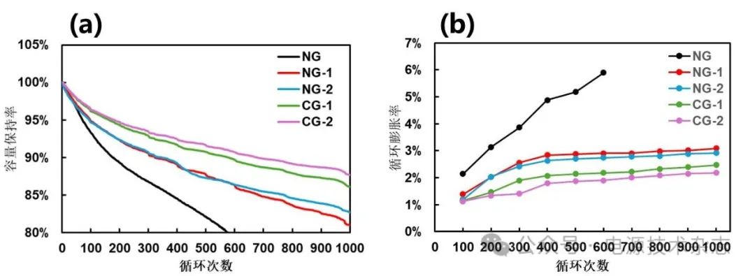 圖6展示了不同石墨材料在25 ℃下以0.5 C充電/1 C放電制式循環(huán)1 000次的容量保持率曲線和電池膨脹率曲線,可以看到,未經(jīng)致密化處理的普通天然石墨材料循環(huán)膨脹率較高,對(duì)應(yīng)的循環(huán)壽命也較差,循環(huán)600次后,容量保持率就衰減到80%以下(79.1%);而致密化天然石墨循環(huán)膨脹率大幅降低,循環(huán)1 000次后,容量保持率仍在80%以上,其中NG-1為81%,NG-2為82.7%,且隨致密化程度提高,材料循環(huán)膨脹率降低,容量保持率提高。表明致密化處理可降低循環(huán)過程中材料的膨脹率,緩解因膨脹帶來的顆粒開裂及電解液滲入導(dǎo)致的SEI重復(fù)增長(zhǎng)現(xiàn)象,因此Li+消耗減少,材料循環(huán)壽命提高。與致密化天然石墨相比,復(fù)合石墨循環(huán)膨脹率更低,容量保持率更高,循環(huán)1 000次后,NG-1的容量保持率為86.1%,NG-2為87.7%。這主要是因?yàn)槿嗽焓w粒內(nèi)部完全致密,且經(jīng)過二次造粒后,各向同性更好,因此循環(huán)膨脹率較低,容量保持率較高。