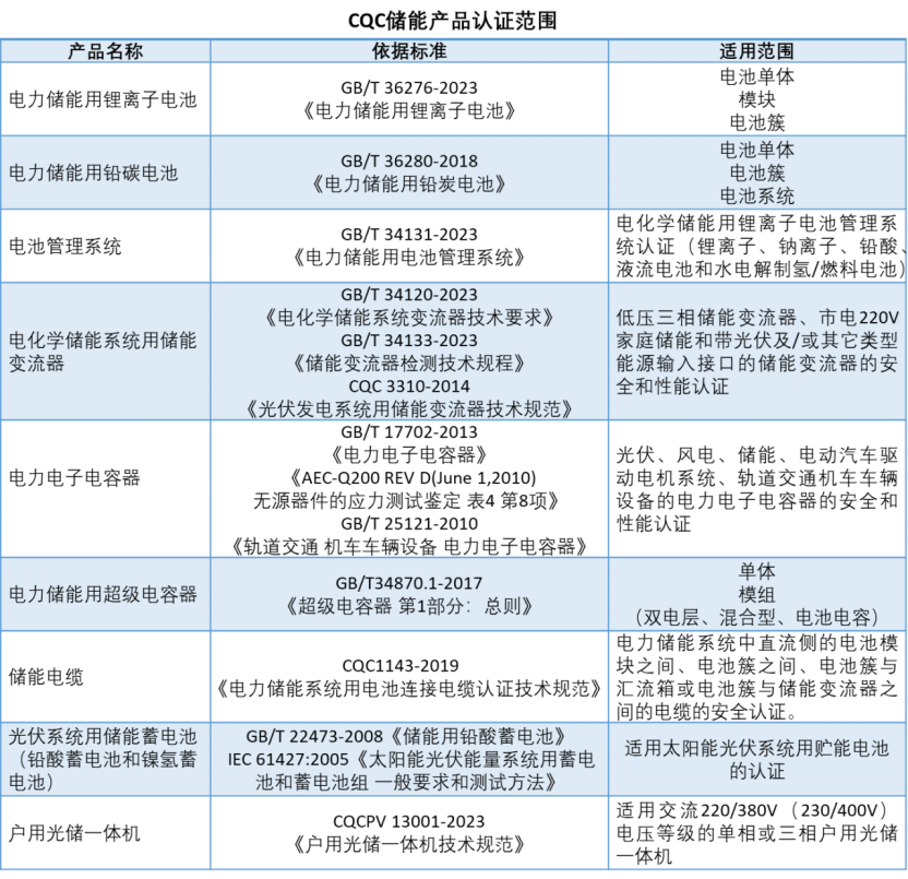 電力儲(chǔ)能產(chǎn)品認(rèn)證范圍包括:電力儲(chǔ)能用鋰離子電池、鉛炭電池、蓄電池、超級(jí)電容器、電池管理系統(tǒng)(BMS)、儲(chǔ)能變流器(PCS)、光儲(chǔ)一體機(jī)。CQC通過產(chǎn)品的型式檢驗(yàn)、工廠檢查、獲證后監(jiān)督等流程,對(duì)儲(chǔ)能核心部件產(chǎn)品進(jìn)行全面的質(zhì)量監(jiān)督。