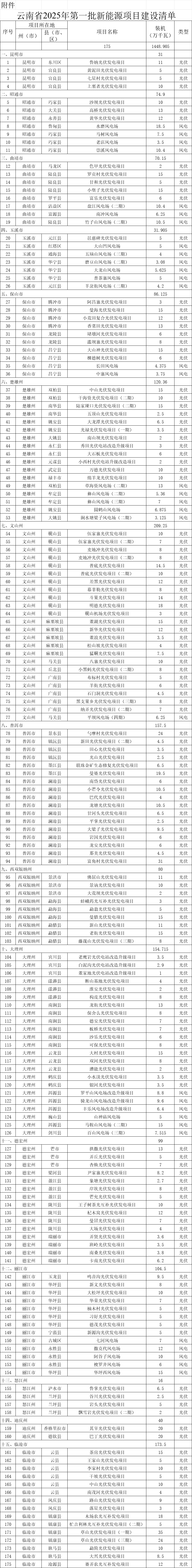 一、工作目標(biāo)納入云南省2025年第一批新能源項目開發(fā)建設(shè)方案實施的項目共175個,裝機1448.905萬千瓦,其中光伏項目143個,裝機1203.4萬千瓦;風(fēng)電項目32個,裝機245.505萬千瓦(詳見附件)。
