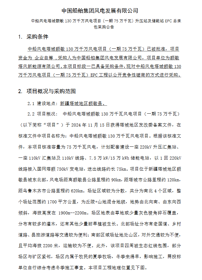 中國儲能網(wǎng)訊:近日,中國船舶集團發(fā)布中船風電塔城額敏130萬千萬風電項目(一期75萬千瓦)升壓站及儲能站EPC采購。該項目位于新疆塔城地區(qū)額敏縣,由額敏塔風新能源有限公司投資建設容量為1300MW風電項目,本期建設750MW風電及儲能,配置儲能容量為風電裝機的10%/2小時,總規(guī)模為75MW/150MWh。