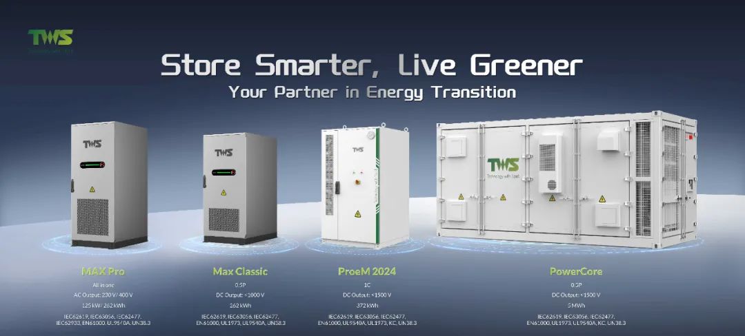 ProeM-2024是TWS明美新能源最新迭代的工商業(yè)儲(chǔ)能柜,具備高效靈活、安全可靠、安裝便捷、智慧友好四大優(yōu)點(diǎn),可實(shí)現(xiàn)1C充放電,同時(shí)設(shè)計(jì)不同容量配置,充分靈活滿(mǎn)足不同客戶(hù)的應(yīng)用需求,適用于工業(yè)園區(qū)、商業(yè)綜合體、充電站、微網(wǎng)系統(tǒng)等多種能源存儲(chǔ)應(yīng)用場(chǎng)景。MAX系列是公司在2025年推出的工商業(yè)領(lǐng)域儲(chǔ)能產(chǎn)品,可以滿(mǎn)足工商業(yè)客戶(hù)的能源儲(chǔ)存和調(diào)節(jié)需求,具有高效靈活、安裝便捷、安全可靠、智慧友好四大特點(diǎn)。MAX系列包括Max-Pro和Max-Classic兩個(gè)型號(hào),其中Max-Pro內(nèi)置PCS,實(shí)現(xiàn)交直流一體,節(jié)省占地空間,大大簡(jiǎn)化現(xiàn)場(chǎng)安裝調(diào)試工作、并減少售后維護(hù),提高工程安全性、效率和經(jīng)濟(jì)性。公用事業(yè)應(yīng)用領(lǐng)域,TWS PowerCore 5MWh集裝箱儲(chǔ)能系統(tǒng)搭載1P104S液冷電池包,支持2-4小時(shí)系統(tǒng),系統(tǒng)集成度高,一體倉(cāng)出貨,減少安裝和運(yùn)輸成本,具有高安全、高經(jīng)濟(jì)性、更靈活等特點(diǎn)。