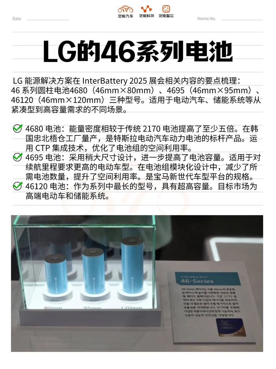 LG能源解決方案在InterBattery 2025展會上以其榮獲“InterBattery Awards”的46系列圓柱形電池為核心,展出的三款產(chǎn)品分別是4680(直徑46mm x 高度80mm)、4695(46mm x 95mm)和46120(46mm x 120mm),覆蓋了從緊湊型到高容量需求的多種應(yīng)用場景。