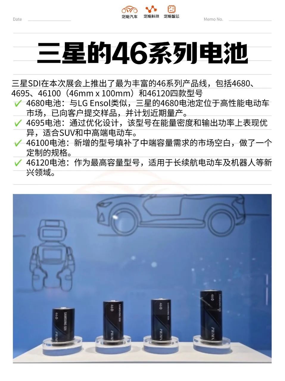 三星SDI在本次展會上推出了最為豐富的46系列產(chǎn)品線,包括4680、4695、46100(46mm x 100mm)和46120四款型號,針對不同客戶需求的靈活性和技術(shù)深度,三星SDI還展出了一款基于4695電池SUV電池組,體現(xiàn)了其從研發(fā)到實際應(yīng)用的快速轉(zhuǎn)化能力。