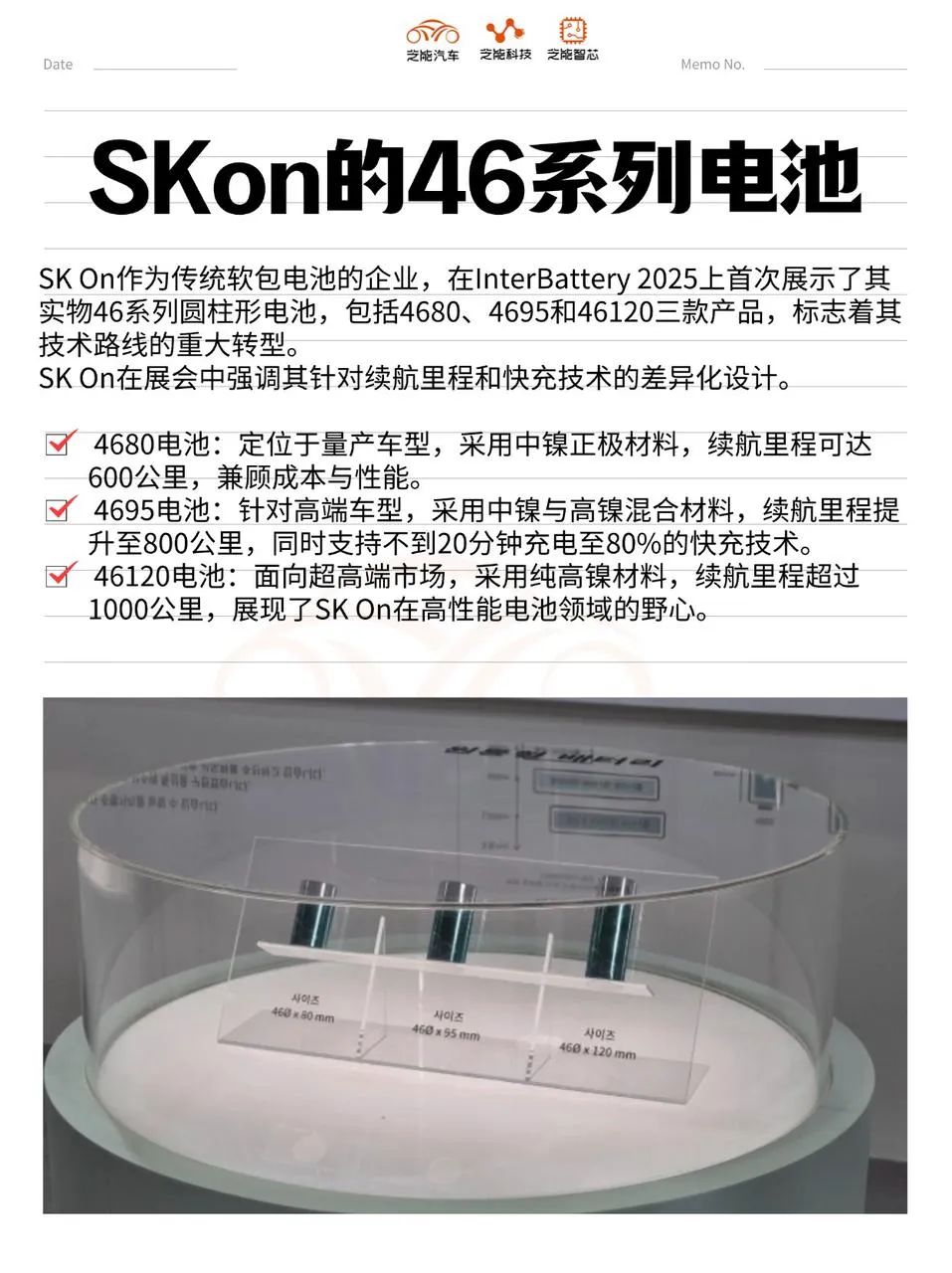 SK On作為傳統(tǒng)軟包電池的企業(yè),在InterBattery 2025上首次展示了其實物46系列圓柱形電池,包括4680、4695和46120三款產(chǎn)品,標(biāo)志著其技術(shù)路線的重大轉(zhuǎn)型。SK On在展會中強調(diào)其針對續(xù)航里程和快充技術(shù)的差異化設(shè)計。