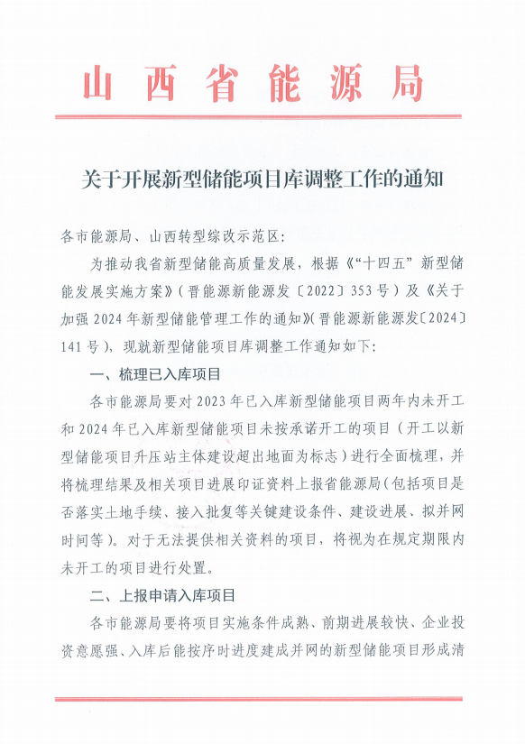 《關(guān)于開展新型儲(chǔ)能項(xiàng)目庫調(diào)整工作的通知》表示各市能源局要對(duì)2023年已入庫新型儲(chǔ)能項(xiàng)目兩年內(nèi)未開工和2024年已入庫新型儲(chǔ)能項(xiàng)目未按承諾開工的項(xiàng)目(開工以新型儲(chǔ)能項(xiàng)目升壓站主體建設(shè)超出地面為標(biāo)志)進(jìn)行全面梳理,并將梳理結(jié)果及相關(guān)項(xiàng)目進(jìn)展印證資料上報(bào)省能源局(包括項(xiàng)目是否落實(shí)土地手續(xù)、接入批復(fù)等關(guān)鍵建設(shè)條件、建設(shè)進(jìn)展、擬并網(wǎng)時(shí)間)。對(duì)于無法提供相關(guān)資料的項(xiàng)目,將視為在規(guī)定期限內(nèi)未開工的項(xiàng)目進(jìn)行處置。