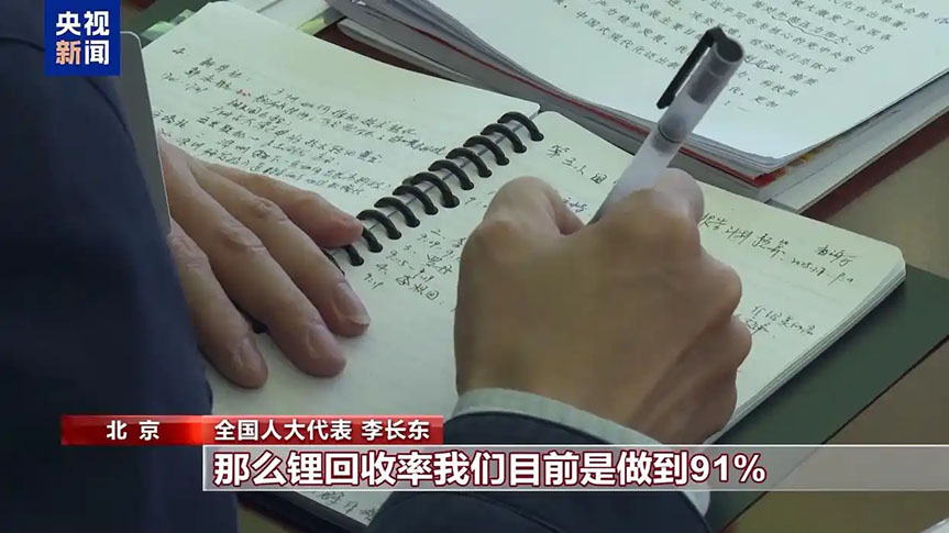 全國人大代表 李長東(采訪):它是一個放錯位置的資源,不管是里面的銅、鋁,包括外殼的不銹鋼,包括里面的負極材料,我們都可以有效回收。目前電池回收根據(jù)金屬不同,比如鎳、鈷、錳這些有價的金屬,今天可以做到99.3%,鋰回收率我們目前做到91%。