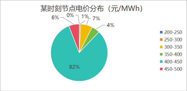 以廣東電力市場某時刻的節(jié)點(diǎn)電價為例。上圖為廣東電力市場某時刻節(jié)點(diǎn)電價分布,此時平均電價約426元/MWh,但各節(jié)點(diǎn)電價從205元/MWh到541元/MWh不等,有18%的電站與市場交易均價的差異超過25元/MWh。