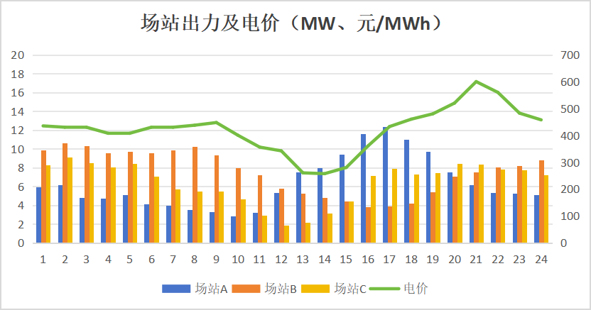 現(xiàn)貨市場環(huán)境下,市場交易均價取發(fā)電側(cè)實(shí)時市場同類項(xiàng)目加權(quán)平均價格確定,而不同項(xiàng)目的資源特性存在差異,假如有A、B、C三座電站某月分時平均出力曲線如圖所示,則其分時加權(quán)價格分別為422元/MWh、416元/MWh、430元/MWh,即場站C由于出力取消和電價曲線更加匹配,能夠達(dá)到更高水平的收益。