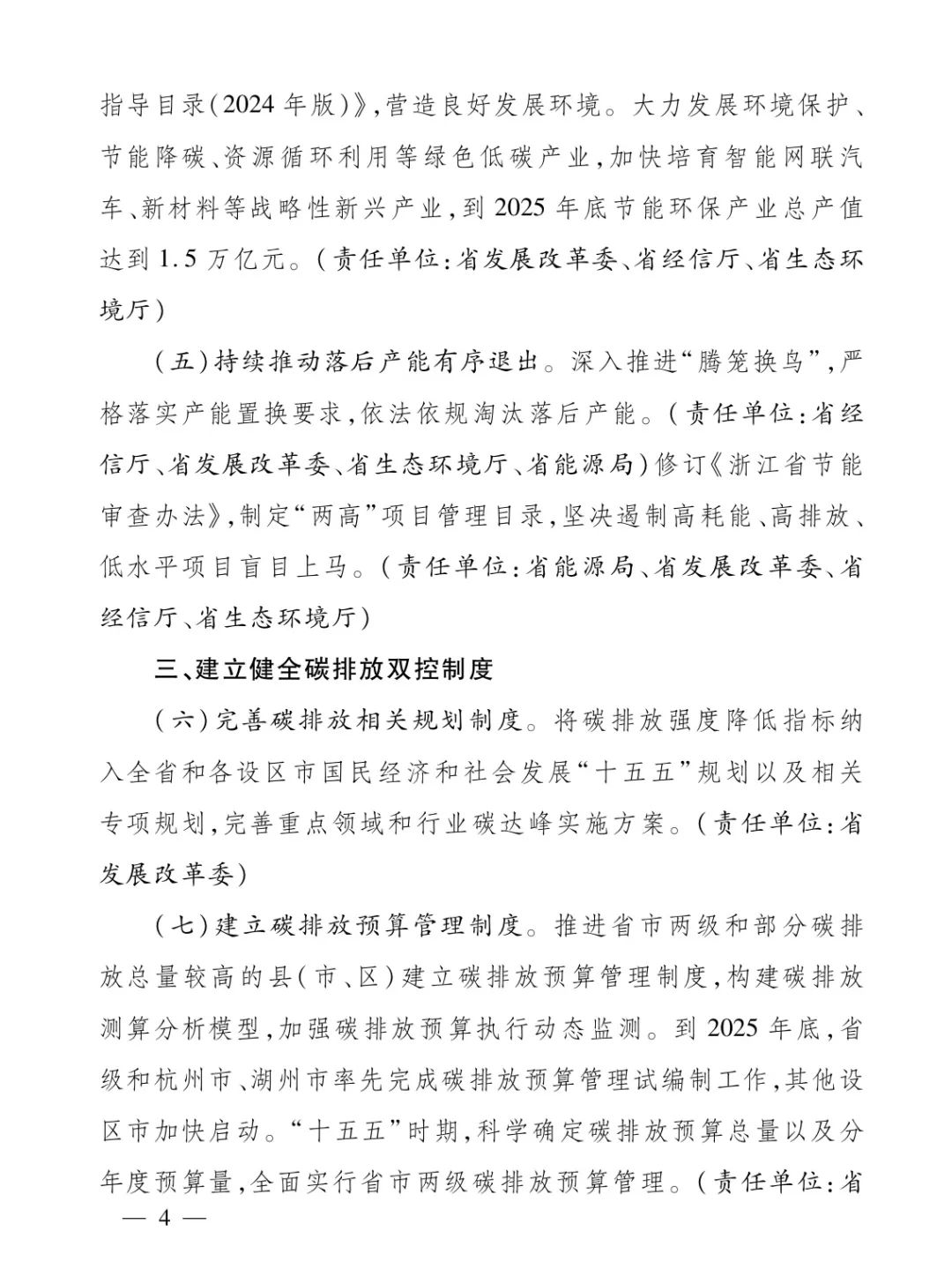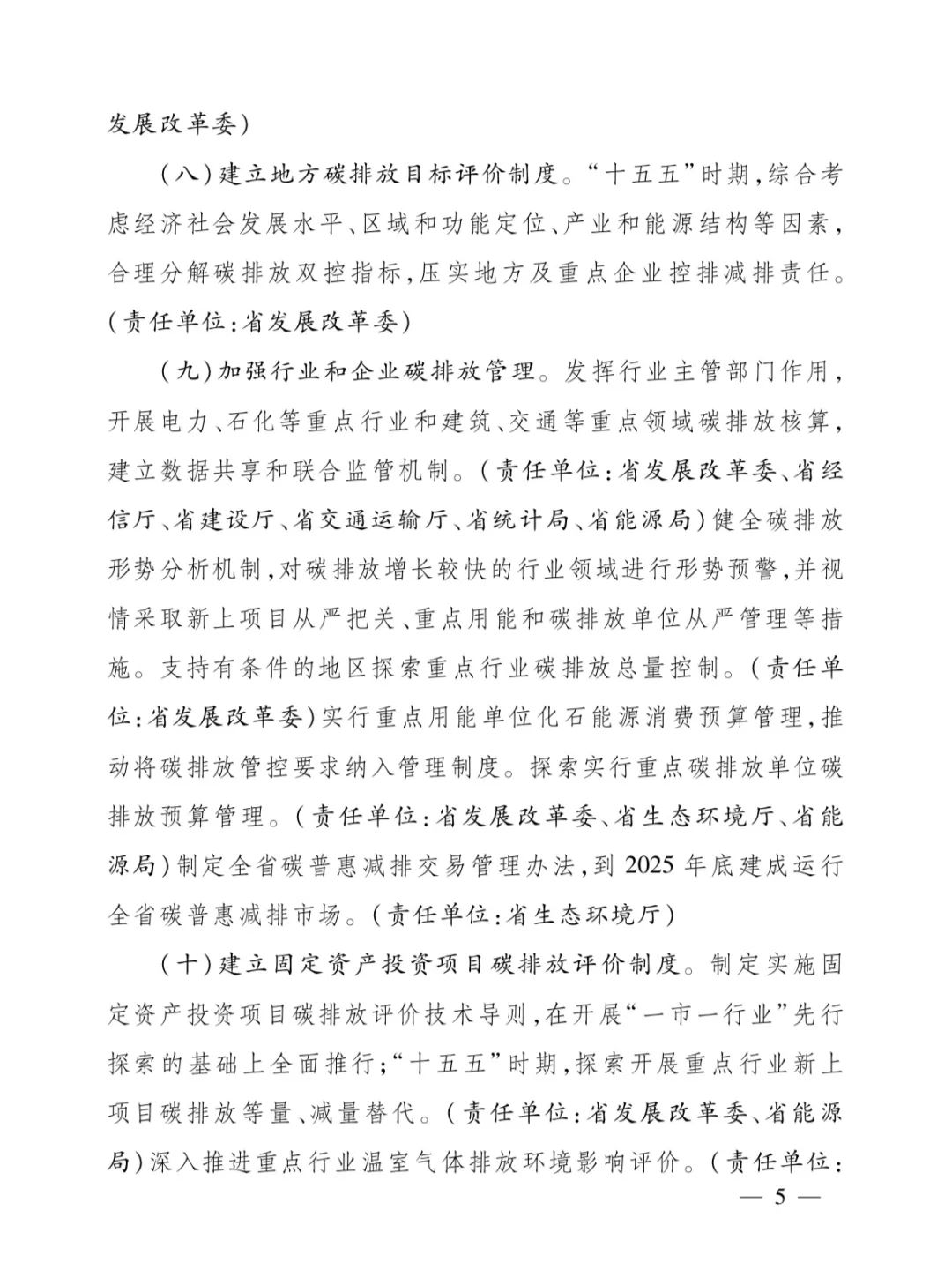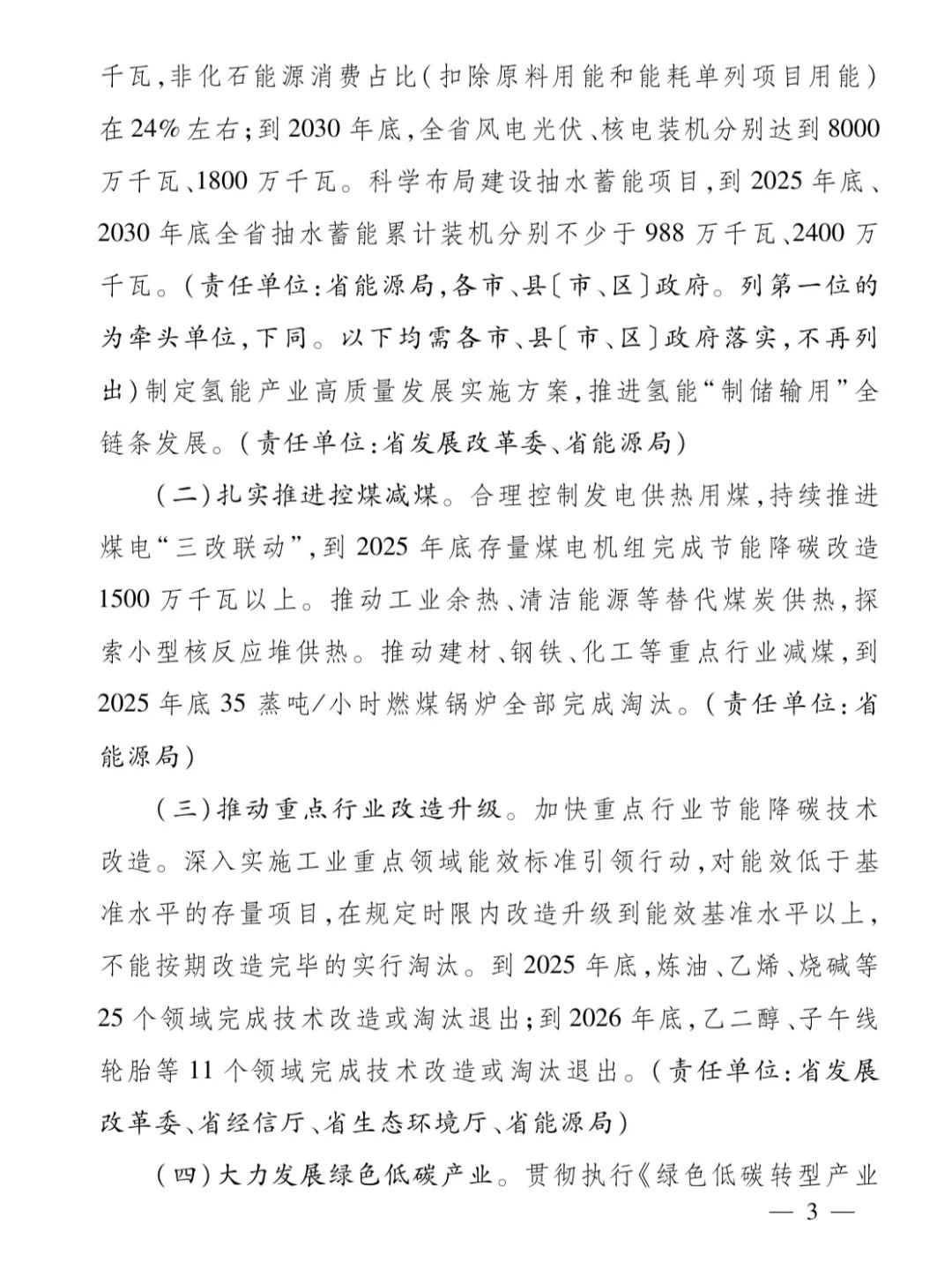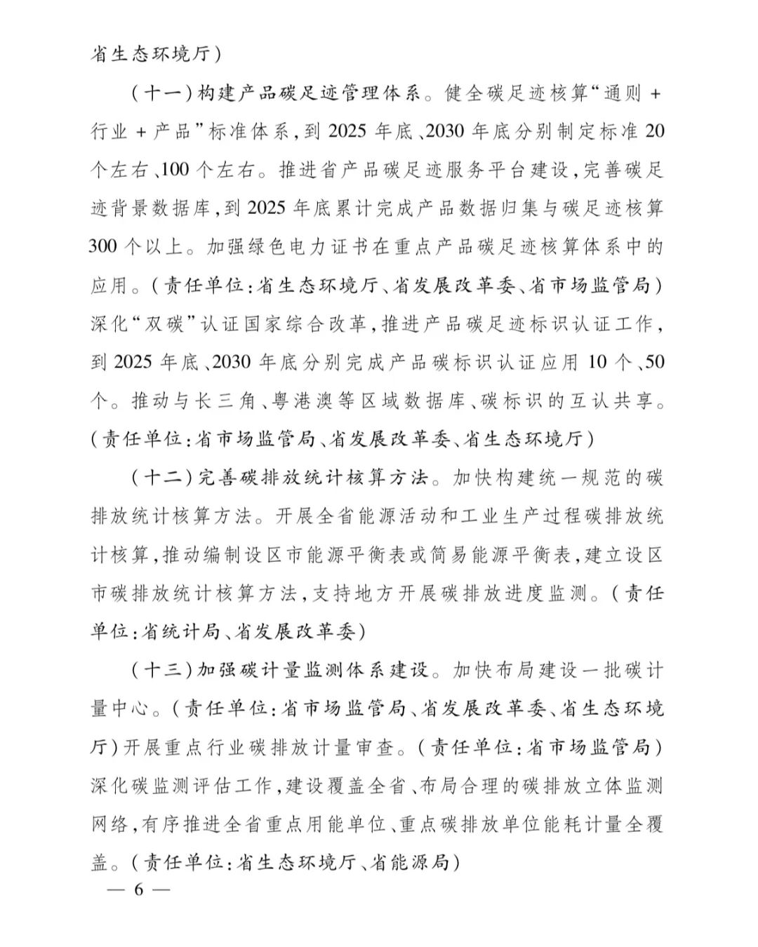 舉措明確對(duì)“十四五”期間的碳排放工作進(jìn)行了總結(jié),碳排放雙控先行先試、碳排放預(yù)算管理編制探索、碳排放統(tǒng)計(jì)核算能力均取得了良好的成果?!笆逦濉睍r(shí)期,實(shí)施以強(qiáng)度控制為主、總量控制為輔的碳排放雙控制度,建立健全地方碳考核、區(qū)域碳預(yù)算、行業(yè)碳管控、企業(yè)碳管理、項(xiàng)目碳評(píng)價(jià)、產(chǎn)品碳足跡等配套制度,確保如期實(shí)現(xiàn)碳達(dá)峰目標(biāo)。在推進(jìn)碳減排重點(diǎn)工作上。要大力發(fā)展非化石能源,推進(jìn)“光伏+”行動(dòng),有序推進(jìn)核電、海上風(fēng)電項(xiàng)目建設(shè),大力發(fā)展生物質(zhì)能、地?zé)崮?、海洋能等新能源?strong>到2025年底,新增風(fēng)電光伏裝機(jī)600萬千瓦、核電裝機(jī)100萬千瓦,非化石能源消費(fèi)占比(扣除原料用能和能耗單列項(xiàng)目用能)在24%左右;到2030年底,全省風(fēng)電光伏、核電裝機(jī)分別達(dá)到8000萬千瓦、1800萬千瓦。