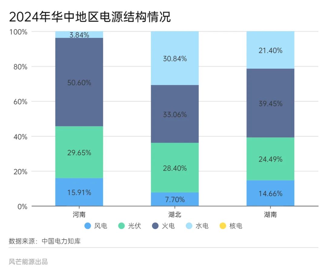 從裝機(jī)結(jié)構(gòu)來看,華中地區(qū)3省新能源裝機(jī)在電力總裝機(jī)中占比均不足50%。其中,河南省火電裝機(jī)仍占主導(dǎo),在電力裝機(jī)中占比達(dá)50.6%;湖南、湖北兩省電源裝機(jī)中,水電地位較為突出,裝機(jī)占比分別達(dá)30.84%、21.4%。