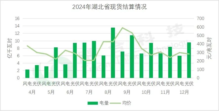 4月16日電力現(xiàn)貨市場開展后,新能源部分上網(wǎng)電量按照優(yōu)先上網(wǎng)電量結(jié)算,視作保障性收購電量。2024年4-12月結(jié)算均價(jià)332.22元/兆瓦時(shí)。