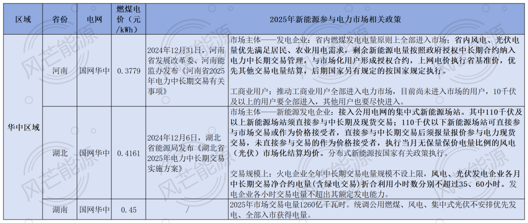 從已有政策層面來看,河南、湖北兩省已發(fā)布2025年電力交易方案。整體來看,除湖南外,2025年市場交易規(guī)模與2024年基本持平;入市主體和入市比例有所變化。