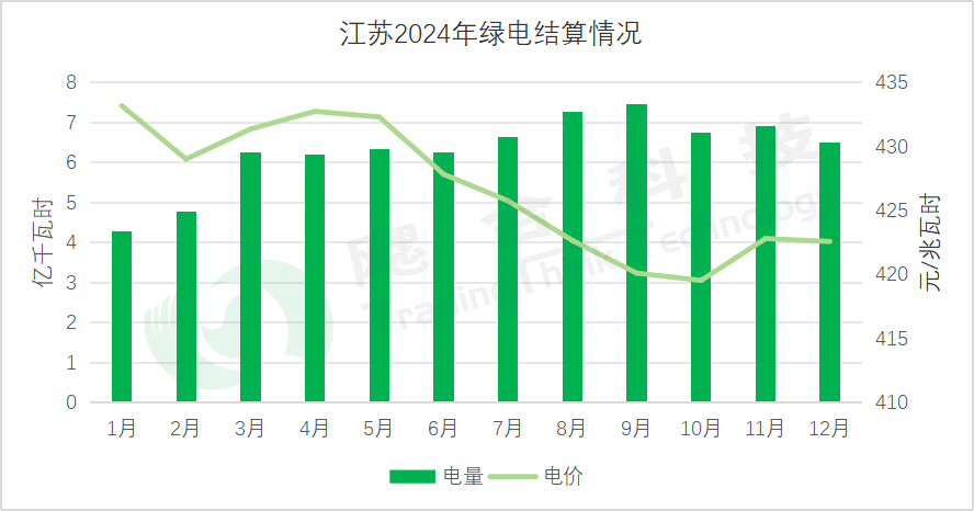 江蘇省優(yōu)先發(fā)電價(jià)格為燃煤基準(zhǔn)價(jià)391元/兆瓦時(shí)。江蘇省新能源場站綠電交易以外的電量以煤電基準(zhǔn)價(jià)執(zhí)行全額保障性收購。2024年江蘇綠電結(jié)算均價(jià)426.19元/兆瓦時(shí),綠色環(huán)境權(quán)益均價(jià)24.92元/兆瓦時(shí)。