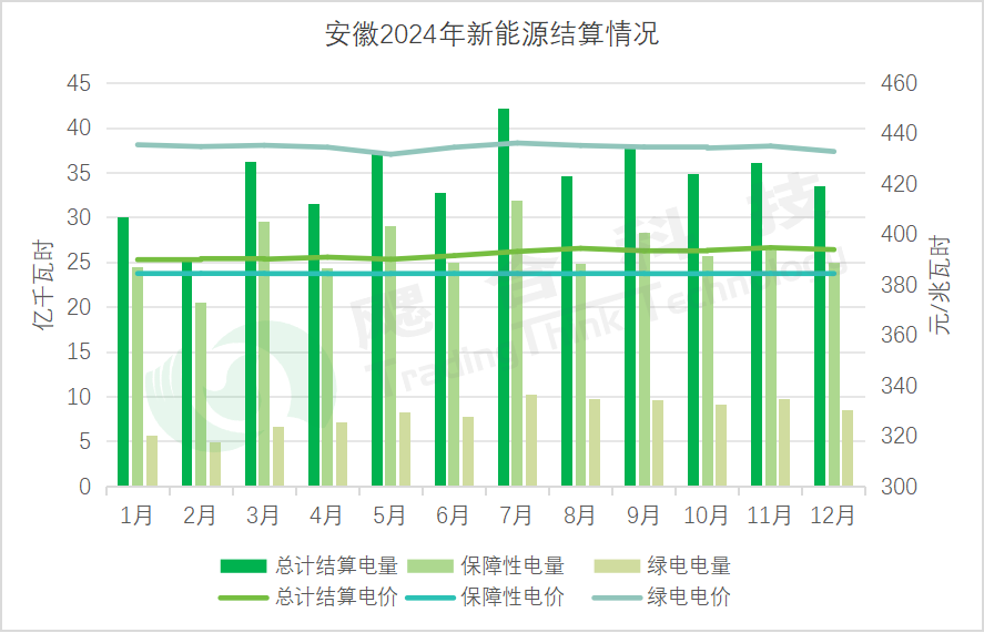 安徽:安徽2024年新能源總計(jì)結(jié)算電量412.62億千瓦時(shí),結(jié)算均價(jià)392.35元/兆瓦時(shí)。其中保障性電量315.20億千瓦時(shí),結(jié)算均價(jià)384.49元/兆瓦時(shí);綠電結(jié)算電量97.43億千瓦時(shí),結(jié)算均價(jià)434.64元/兆瓦時(shí)。