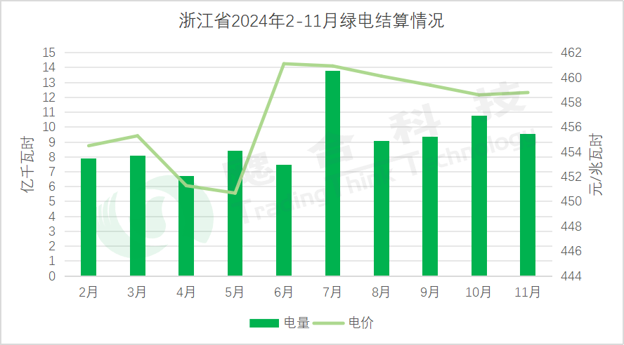 浙江:2024年,浙江電力交易中心配合北京電力交易中心組織綠電交易25場,成交電量合計(jì)113.59億千瓦時(shí)。2024年2-11月浙江省結(jié)算綠電約91億千瓦時(shí),均價(jià)457.49元/兆瓦時(shí)。