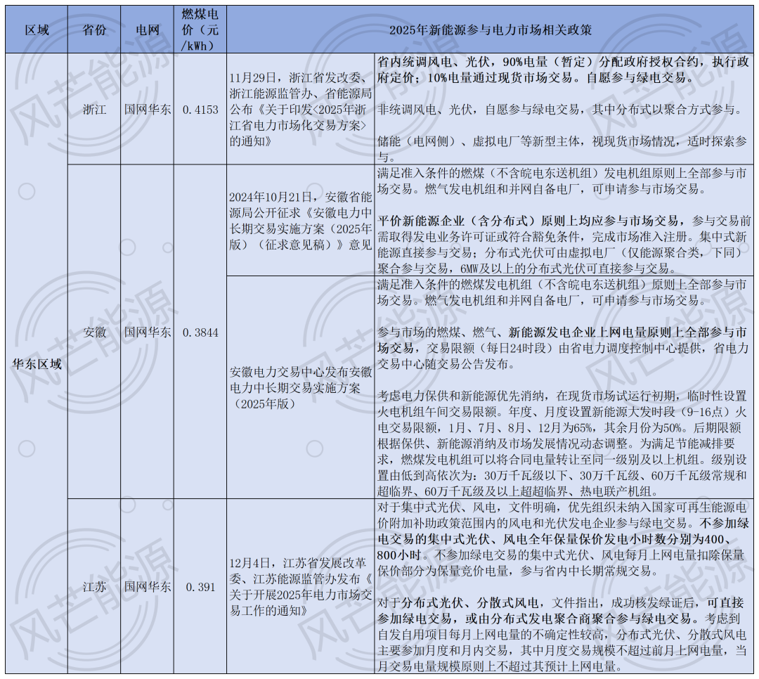 從已有政策層面來看,目前華東三省均已發(fā)布2025年電力交易方案。整體來看,除安徽外,其余省份2025年市場交易規(guī)模與2024年基本持平,入市主體和入市比例有所變化。