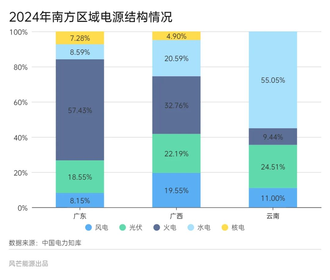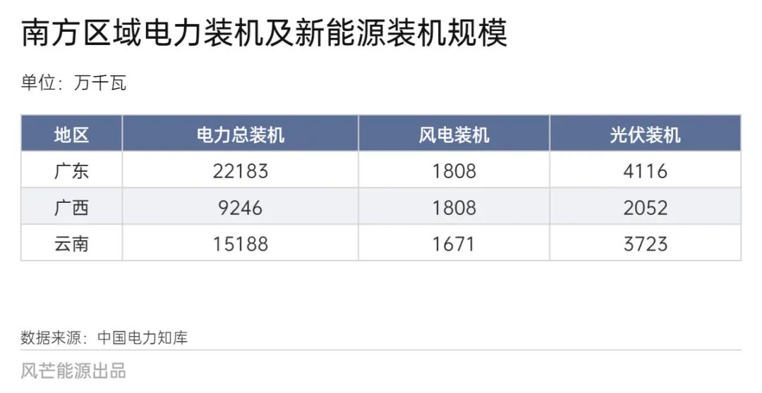 從裝機(jī)結(jié)構(gòu)來看,從南方3省電源結(jié)構(gòu)迥異,除“新能源非主導(dǎo)電源”這一共同點(diǎn)外,廣東、廣西及云南電力裝機(jī)各有特點(diǎn)。