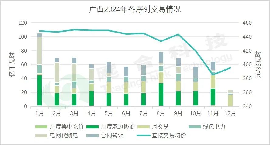 廣西:廣西2024年累計(jì)直接交易成交電量1102.48億千瓦時(shí),平均成交價(jià)格444.85元/兆瓦時(shí),較燃煤基準(zhǔn)上網(wǎng)電價(jià)上漲24.15元/兆瓦時(shí)。從10月開始交易價(jià)格開始極速降低,至12月平均成交價(jià)降至406.70元/兆瓦時(shí),較燃煤基準(zhǔn)上網(wǎng)電價(jià)下降14元/兆瓦時(shí)。