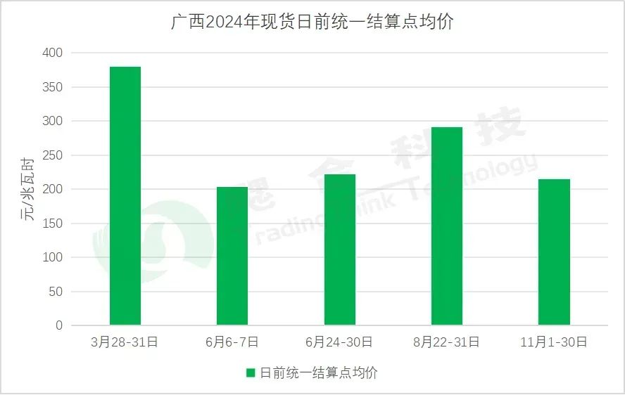 廣西2024年在四個(gè)季度均開展了現(xiàn)貨結(jié)算試運(yùn)行,現(xiàn)貨期間日前統(tǒng)一結(jié)算點(diǎn)算數(shù)平均價(jià)為262.05元/兆瓦時(shí),較燃煤標(biāo)桿電價(jià)降低158.65元/兆瓦時(shí)。