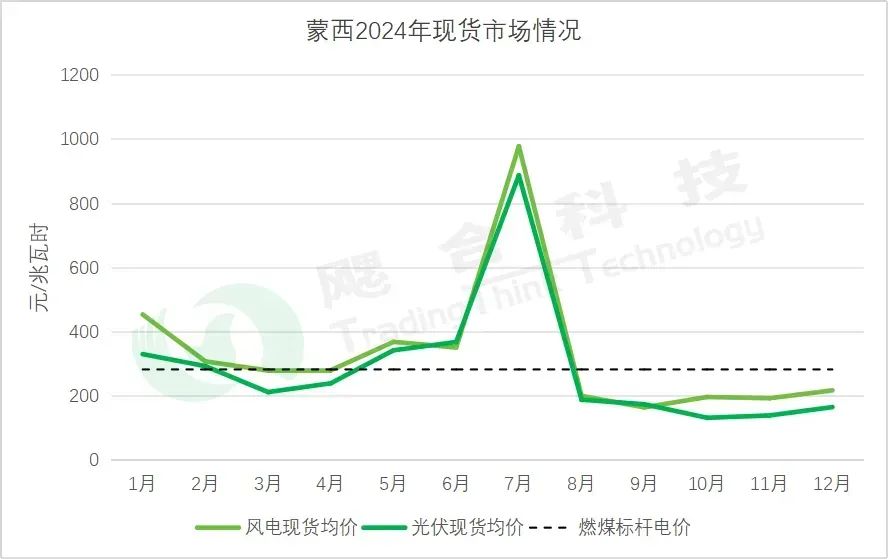 同時(shí),飔合科技分析指出,蒙西光伏裝機(jī)占比較高,受供需條件影響,午間時(shí)段光伏集中出力下極易出現(xiàn)現(xiàn)貨價(jià)格為0元/兆瓦時(shí)的極端情況;而其余非午間時(shí)段現(xiàn)貨價(jià)格受市場壟斷因素顯著影響,在蒙西火電機(jī)組“抱團(tuán)策略”下呈現(xiàn)出明顯的高峰時(shí)段。2024年市場實(shí)時(shí)現(xiàn)貨均價(jià)484.67元/兆瓦時(shí),其中風(fēng)電現(xiàn)貨均價(jià)332.72元/兆瓦時(shí),光伏現(xiàn)貨均價(jià)289.52元/兆瓦時(shí)。