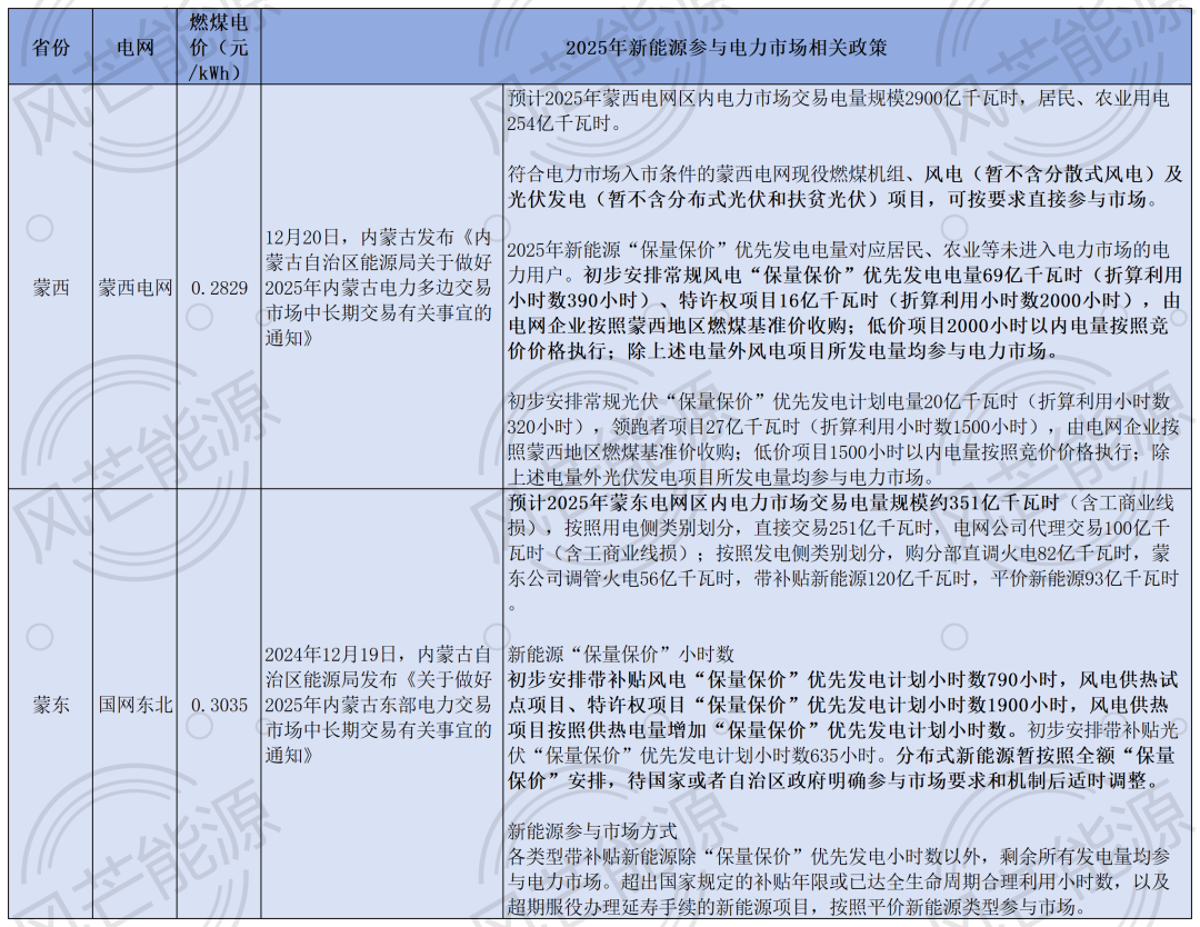 從已有政策層面來看,蒙東、蒙西均已發(fā)布2025年電力交易方案。蒙東2025年放開用戶側(cè)打捆購電比例限制,增加新能源年度交易不得低于60%,按照補(bǔ)貼新能源、火電、平價(jià)新能源開展交易;蒙西進(jìn)一步放開市場限制取消日清分節(jié)點(diǎn)電價(jià)下限約束。