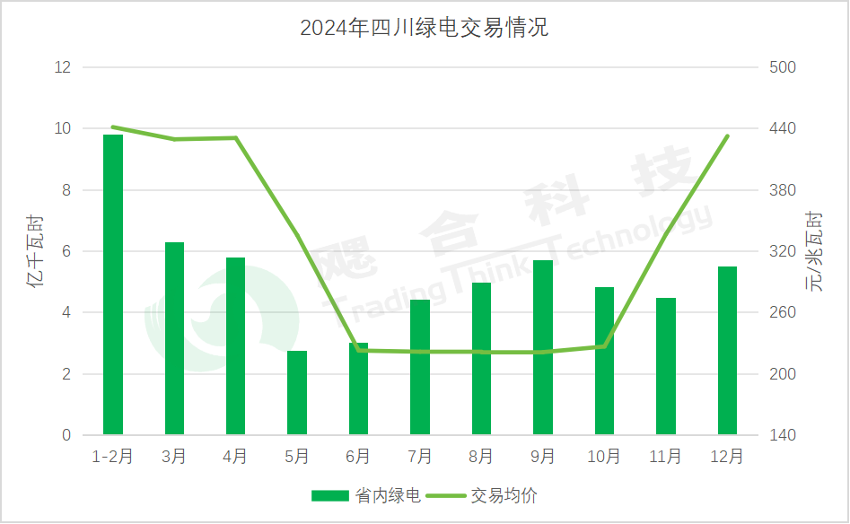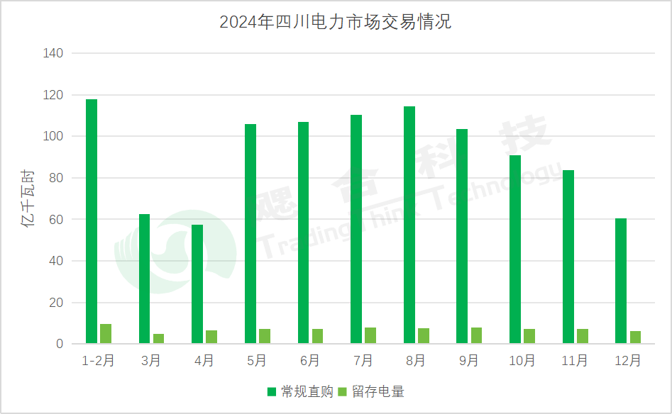 從電力交易情況來看,四川2024年新能源暫不參與現(xiàn)貨市場。2024年四川省內(nèi)市場化交易水電(風(fēng)光)電量共計(jì)1259.16億千瓦時(shí),同比減少8.23%,其中常規(guī)直購1013.54億千瓦時(shí),棄水電量消納108.22億千瓦時(shí),省內(nèi)綠電57.60億千瓦時(shí),綠電均價(jià)337.95元/兆瓦時(shí),留存電量79.80億千瓦時(shí)。