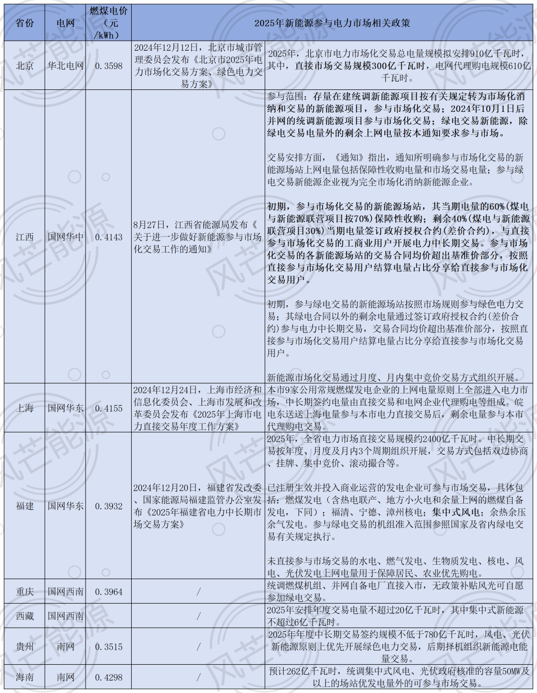 從已有政策層面來看,北京、上海、福建已發(fā)布2025年電力交易方案。2025年市場交易規(guī)模與2024年基本持平,入市主體和入市比例有所變化。