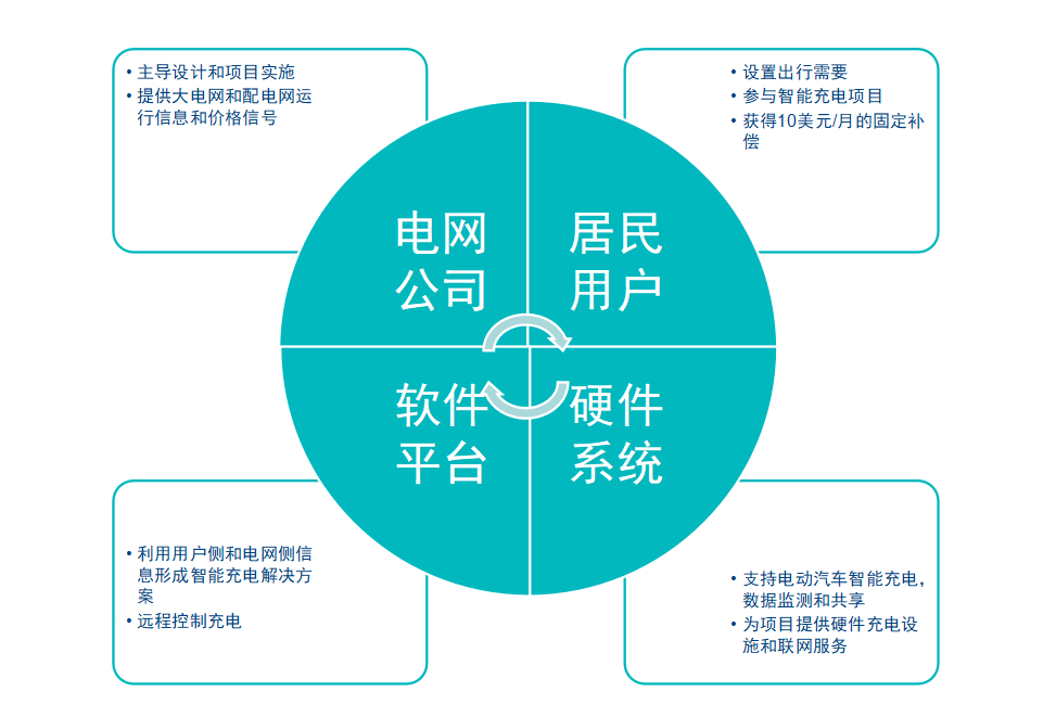 2020年,在美國(guó)能源部支持下,馬里蘭州公共服務(wù)委員會(huì)批準(zhǔn)了在Exelon 旗下的三家電力公司開(kāi)展智能管理充電示范項(xiàng)目。此項(xiàng)目的主要目的是研究探索智能充電系統(tǒng),并根據(jù)大電網(wǎng)配電網(wǎng)的情況優(yōu)化充電,減少電動(dòng)汽車(chē)對(duì)電網(wǎng)的沖擊。對(duì)于擁有電動(dòng)汽車(chē)的居民用戶(hù)而言,他們可以通過(guò)第三方平臺(tái)Weave Grid參與項(xiàng)目,授予其通過(guò)電動(dòng)汽車(chē)充電裝置和車(chē)載信息遠(yuǎn)程收集數(shù)據(jù)和控制充電的權(quán)利,并獲得一定的回報(bào)[8]。智能充電項(xiàng)目涉及了多個(gè)相關(guān)方,除了主要的參與方以外(見(jiàn)下圖),還囊括了非政府組織和聯(lián)邦研究機(jī)構(gòu)的協(xié)助,以確保軟硬件系統(tǒng)的安全可靠,并對(duì)項(xiàng)目進(jìn)行分析評(píng)估和市場(chǎng)推廣。