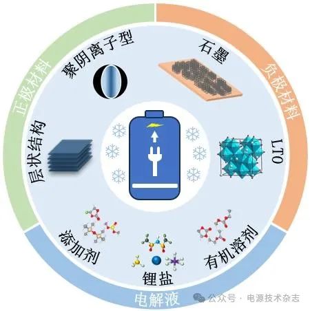 圖1 低溫鋰離子電池常見(jiàn)電極材料及電解液