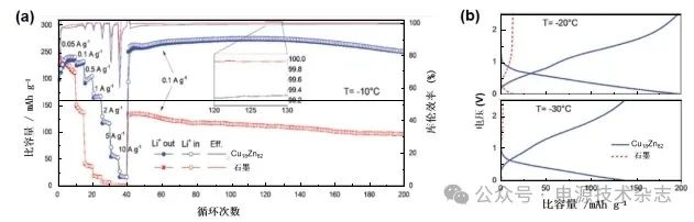 圖6 Cu-Zn合金負(fù)極與工業(yè)石墨在-10 ℃下的倍率和循環(huán)性能對(duì)比(a)以及?20與?30 ℃下的低溫性能對(duì)比[76](b)
